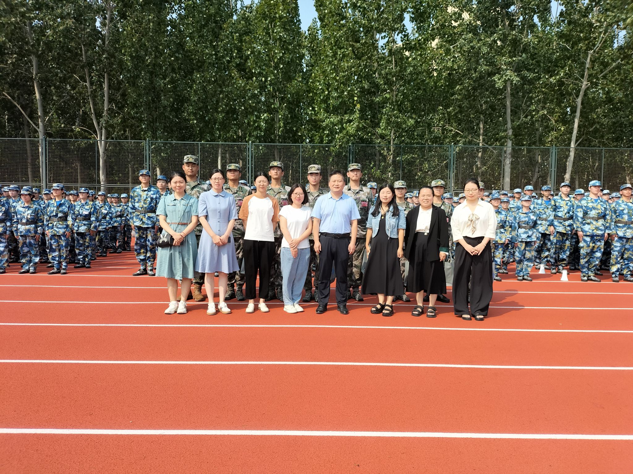 院长胡元森、党委副书记蔡永平以及全体辅导员一行前往训练场地,看望慰问军训教官及2024级新生。