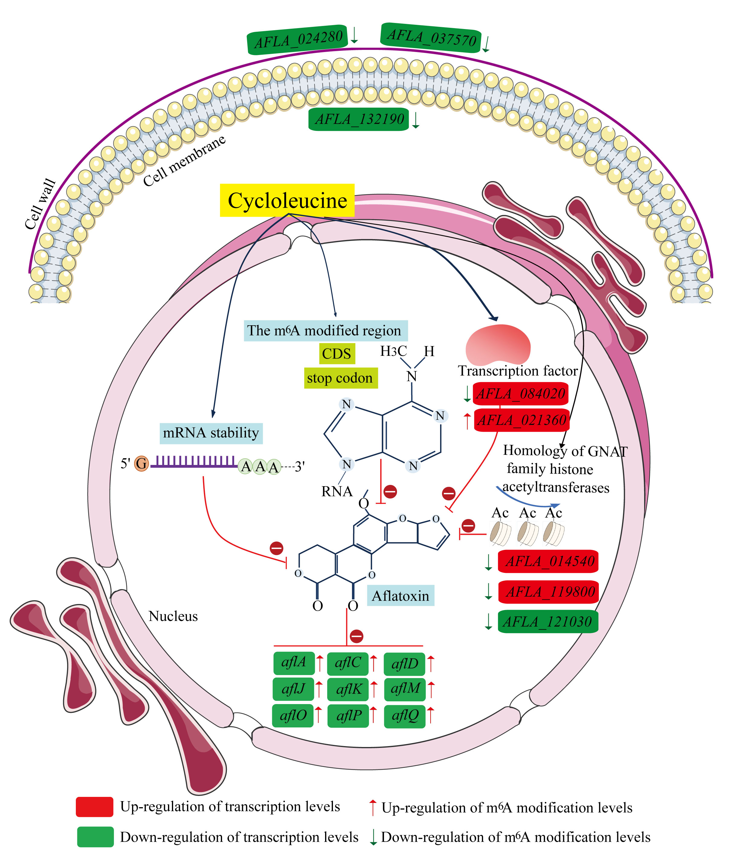 图1环亮氨酸通过m6A甲基化修饰调控黄曲霉毒素B1生物合成的机理图