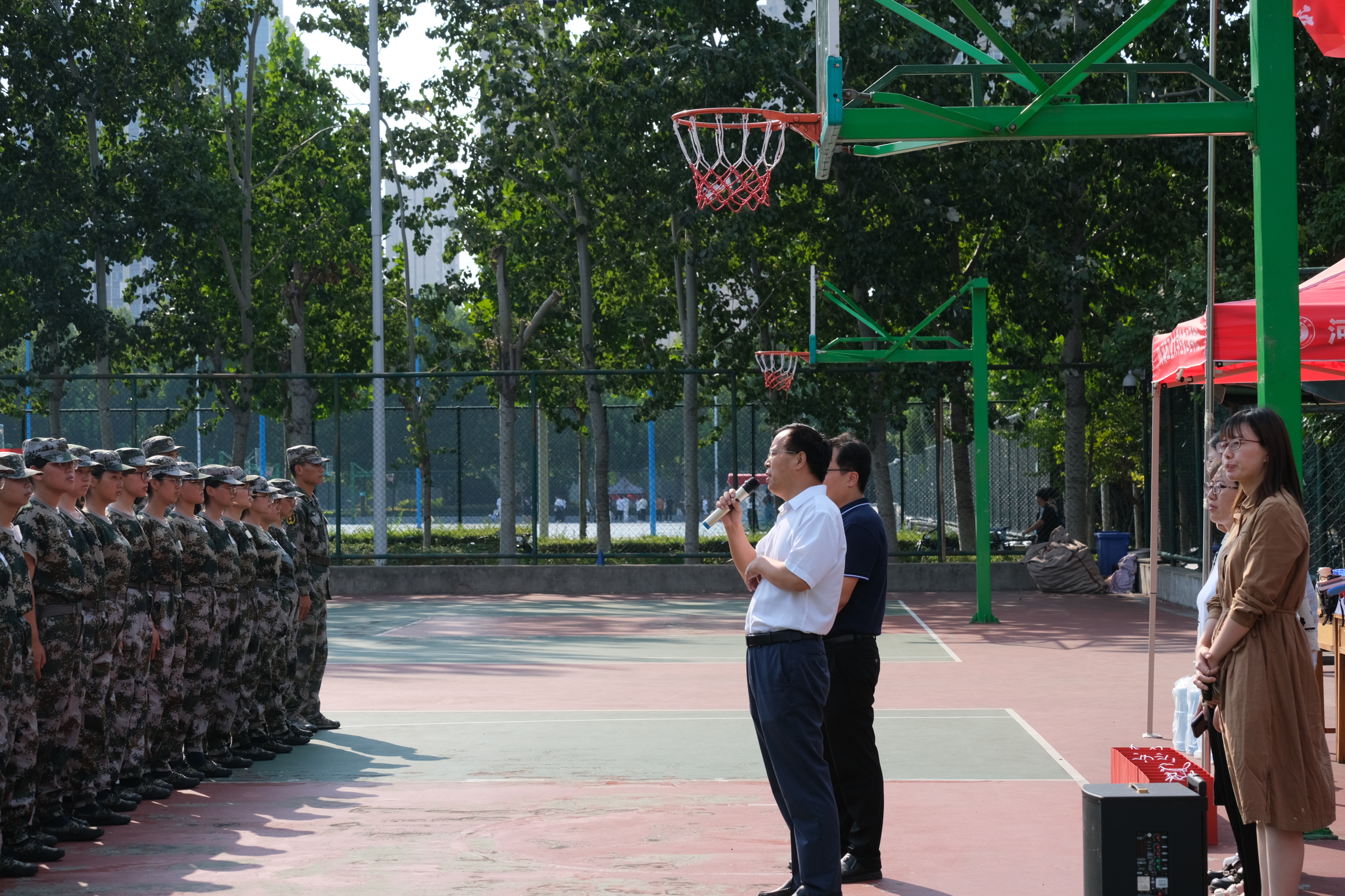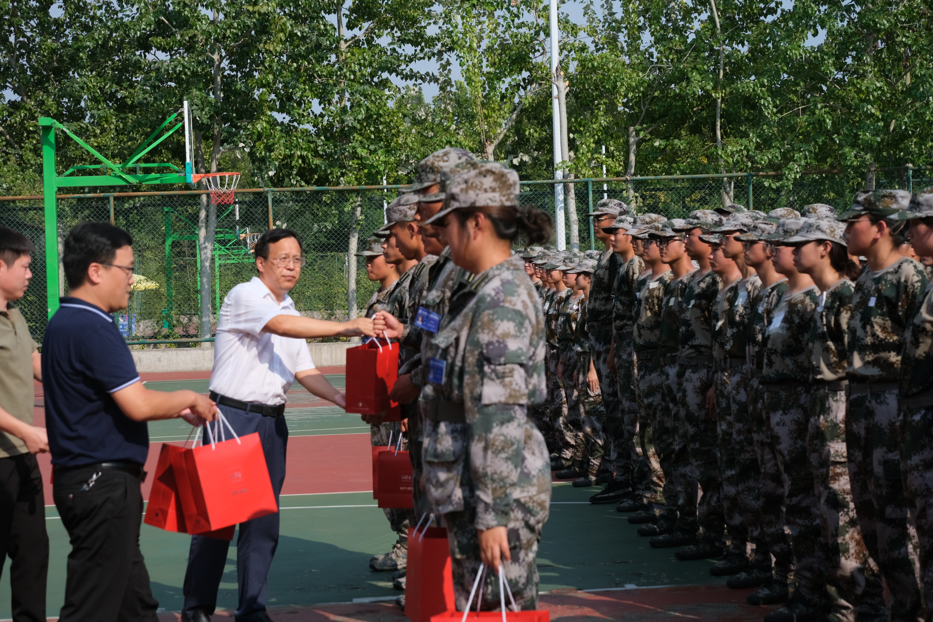 党委书记卫红伟、党委副书记余汉华、学工办主任岳媛媛、团委副书记杨雨薇及全体辅导员一行深入训练场地,看望慰问军训教官及2023级新生。