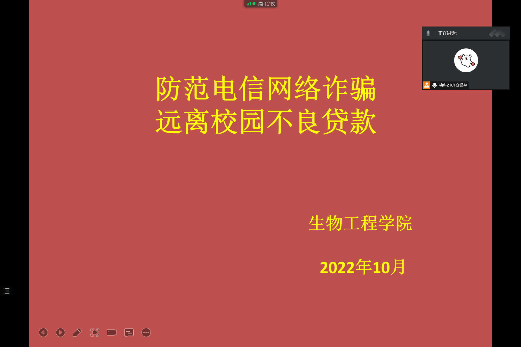 开展防骗班会,避免校贷陷阱。10月1日至2日,各班根据实际情况,班长、宣传委员、团支书等开展以“防范电信网络诈骗 远离不良校园贷款”为主题的班会。通过宣讲金融基础知识、观看预防信贷陷阱视频等提醒同学们警惕电信诈骗,警惕校园不良贷款,提醒同学们遇到困难要理性寻求帮助。此次班会活动增强了同学们防范电信网络诈骗的意识,营造了健康温馨、积极向上的学习环境。