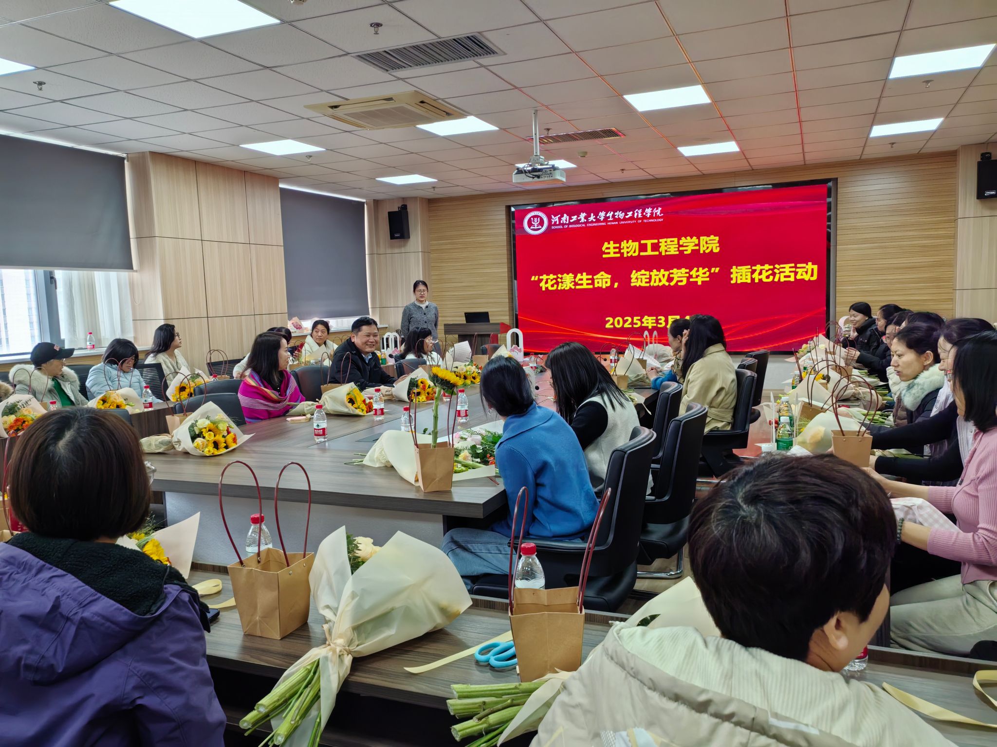 活动现场花香四溢,气氛温馨。花艺师为大家讲解了花卉的种类、花语寓意、色彩搭配等知识,并现场演示了插花技巧和步骤。在花艺师的指导下,老师们充分发挥想象力和创造力,用心构思、精心搭配,创作出一件件独具匠心、赏心悦目的插花作品。活动现场欢声笑语不断,大家互相交流插花心得,分享创作灵感,在花香中感受着节日的喜悦和艺术的魅力。