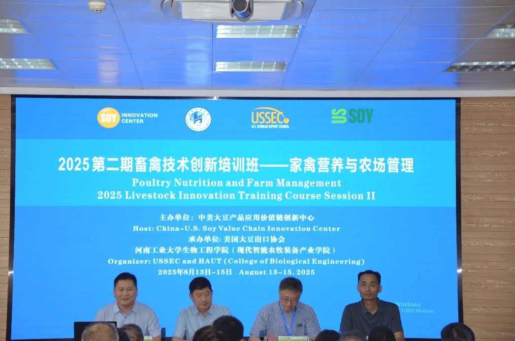 为深化畜禽领域技术创新,构建产业交流协作桥梁,助力行业实现提质增效与转型升级,由中美大豆产品应用价值链创新中心主办,美国大豆出口协会、河南工业大学承办的“2025畜禽技术创新培训班(II)—家禽营养和农场管理培训班”,于8月13日至15日在我校顺利举行。60余位行业专家、企业代表齐聚一堂,共话家禽养殖领域技术创新与发展。