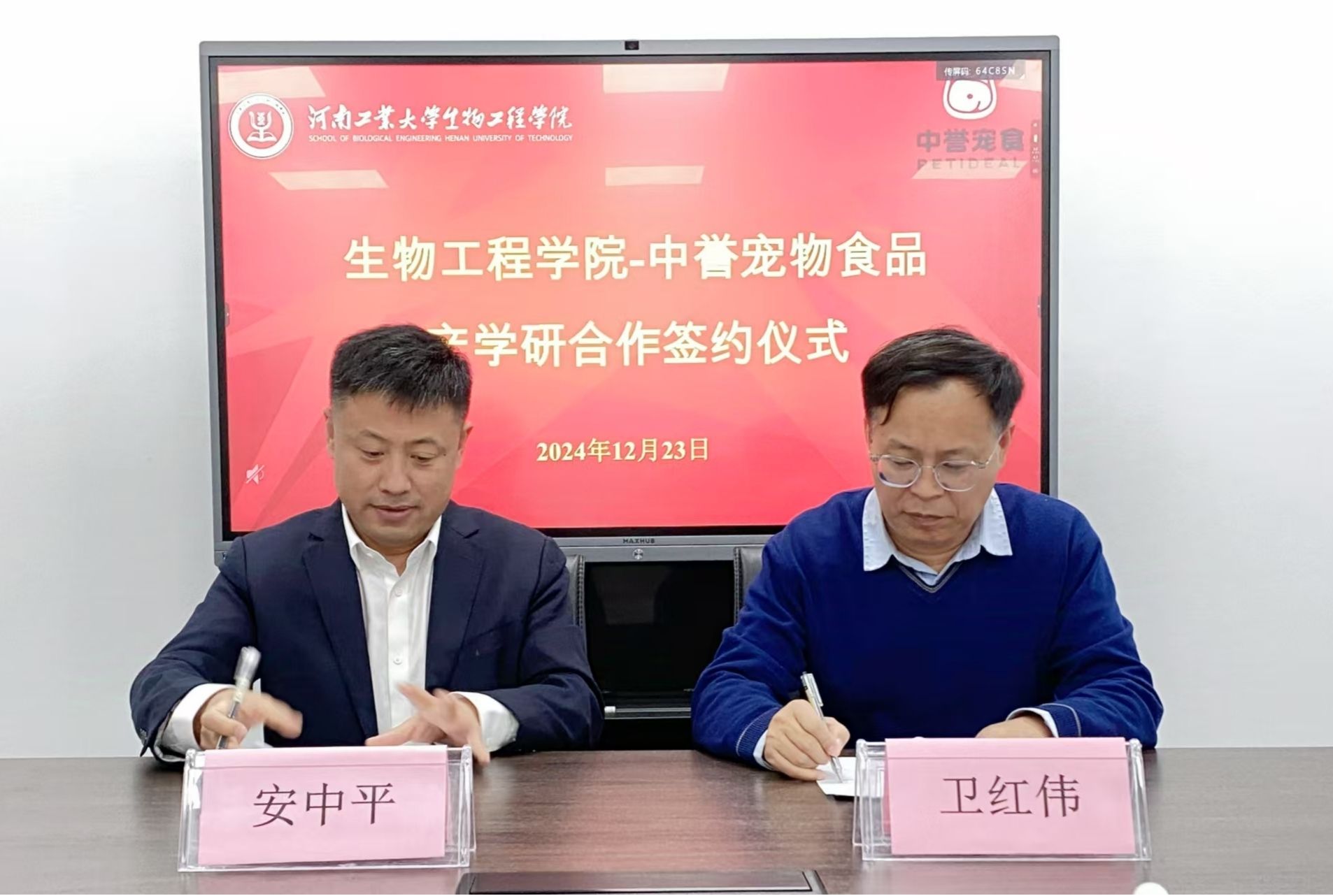 在与会人员的共同见证下,卫红伟和安中平共同签署了合作协议,卫红伟向中誉宠物食品(漯河)有限公司颁授“产学研创新实践基地”牌匾。会后,在汤化钢的带领下,与会人员参观了公司的现代化生产车间及产品展览区域。