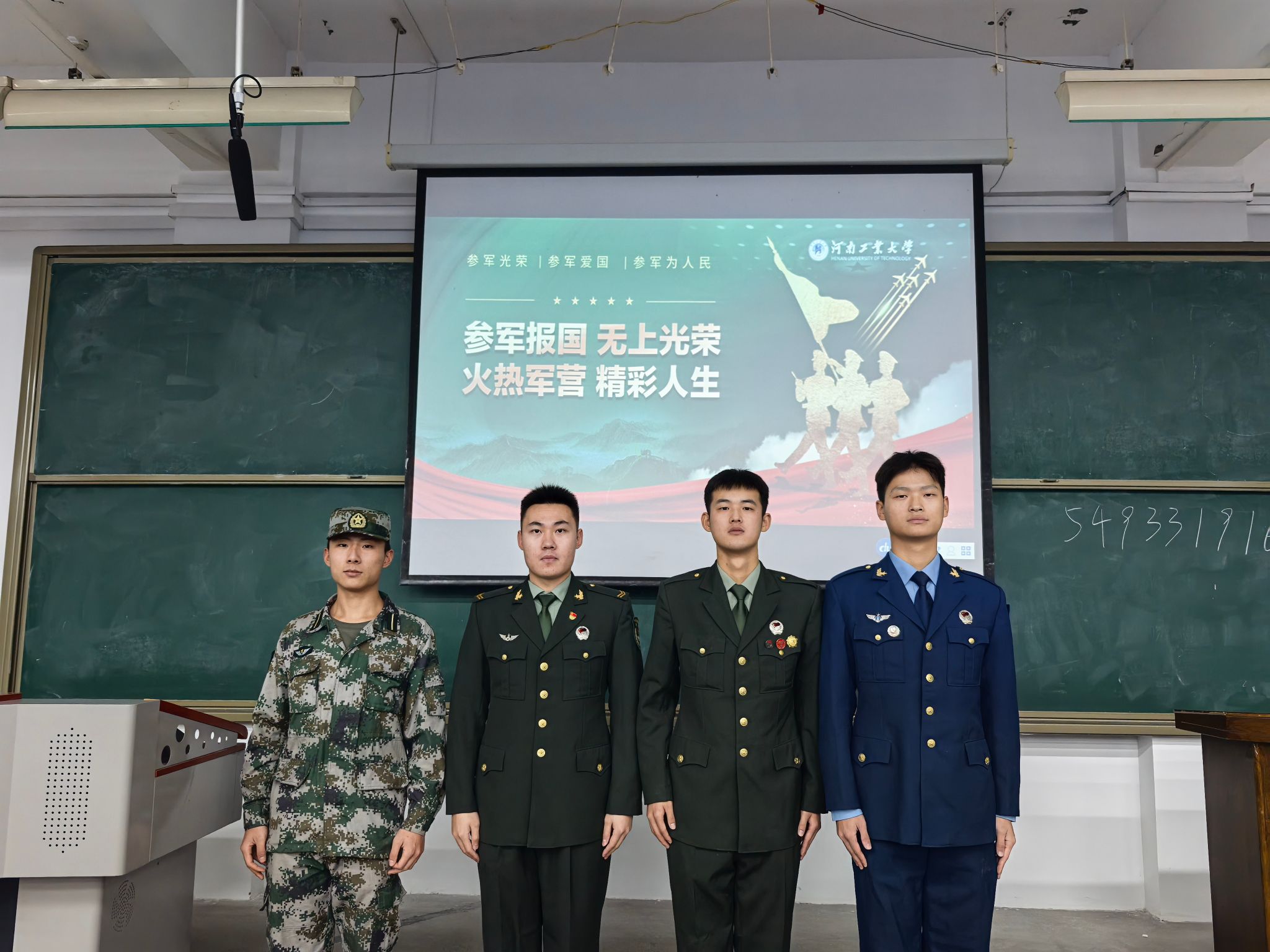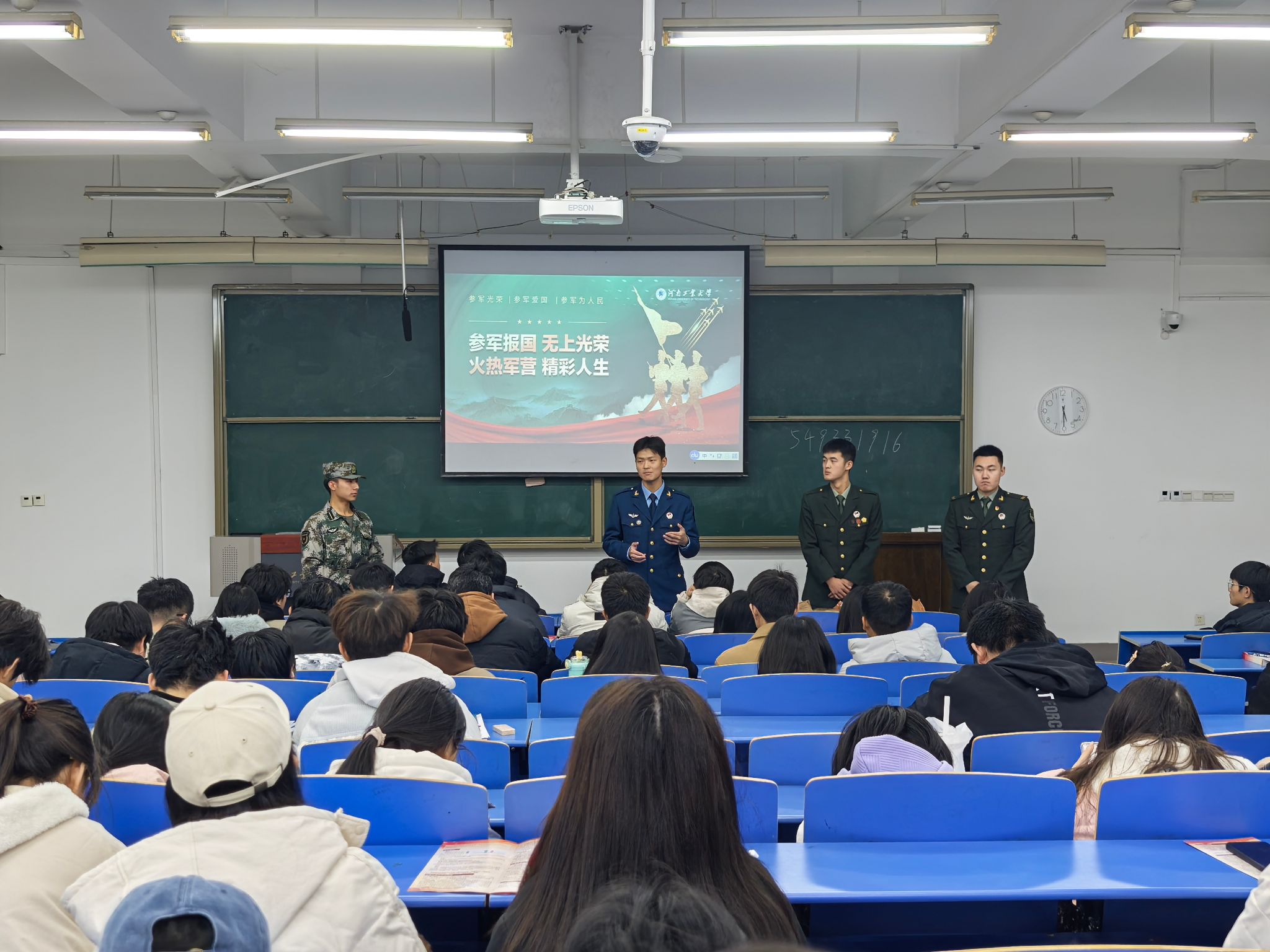 在4号楼4120教室举办了大学生征兵宣讲会。校退役大学生征兵宣讲团成员刘云鹏、孙旸坤、王泽辉和刘子通为同学们分享了参军的经历并讲解了应征入伍的政策,此次宣讲会吸引了众多学生的积极参与,现场气氛热烈。