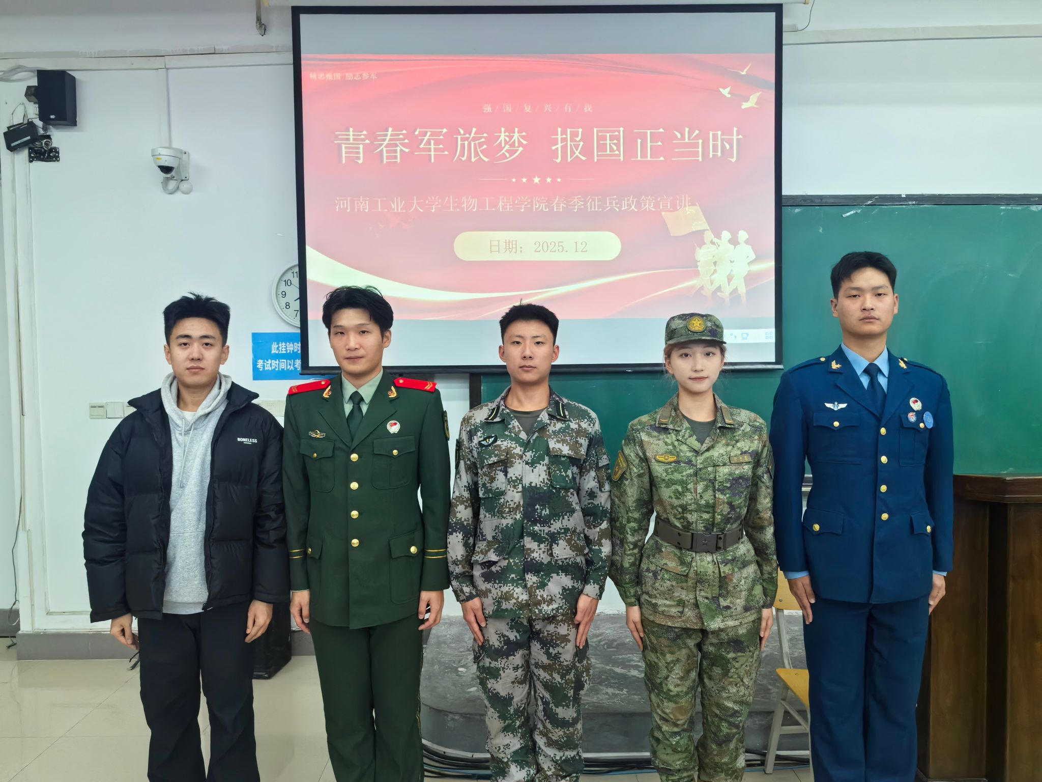 在4号楼4322教室举办了大学生征兵宣讲会。河南工业大学退役大学生征兵宣讲团成员孙旸坤、姬翔、陈勇、郭雨梵和刘子通为同学们分享了参军的经历,并讲解了应征入伍的政策。此次宣讲会吸引了捷报体育比分