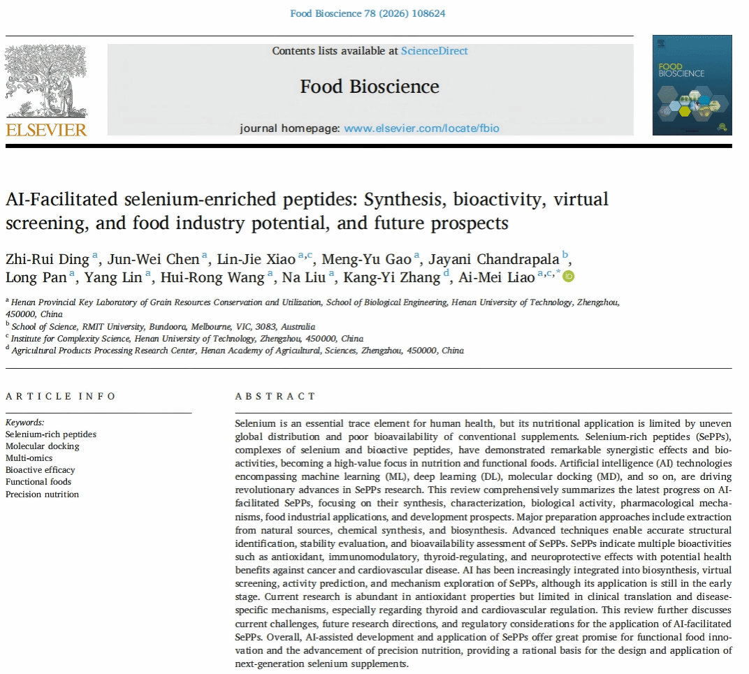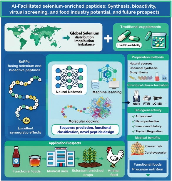 该论文题为“AI-Facilitated selenium-enriched peptides: Synthesis, bioactivity, virtual screening, and food industry potential, and future prospects”。聚焦“AI驱动功能性食品开发”这一明确的前沿方向,系统阐述了AI如何赋能富硒肽的设计、筛选与机制研究;论文不仅总结了现状,更指出了未来技术挑战与发展路径。该工作立足学科交叉热点,展现了捷报体育比分