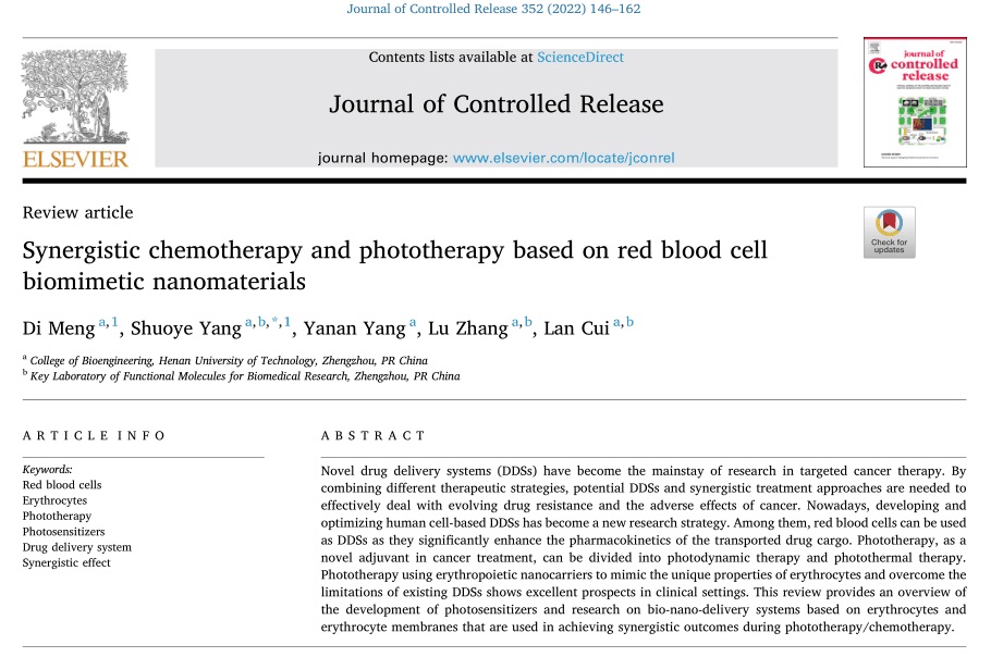 细胞功能调控与化学干预科研团队在国际顶级学术期刊《Journal of Controlled Release》(简称JCR,IF=11.467,中科院1区TOP期刊)上发表了题为“Synergistic Chemotherapy and Phototherapy Based on Red Blood Cell Biomimetic Nanomaterials”的综述论文。该团队2021级硕士研究生蒙迪和杨硕晔副教授为共同第一作者,杨硕晔为通讯作者,河南工业大学为第一署名单位和唯一通讯单位。