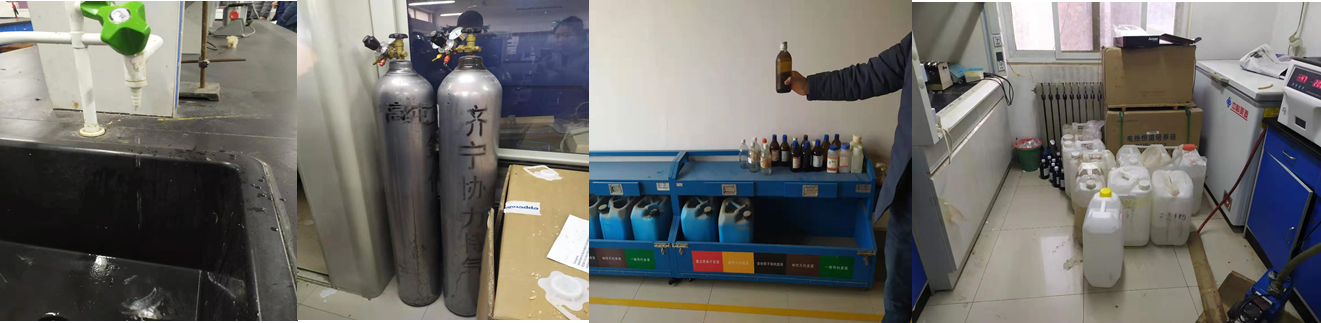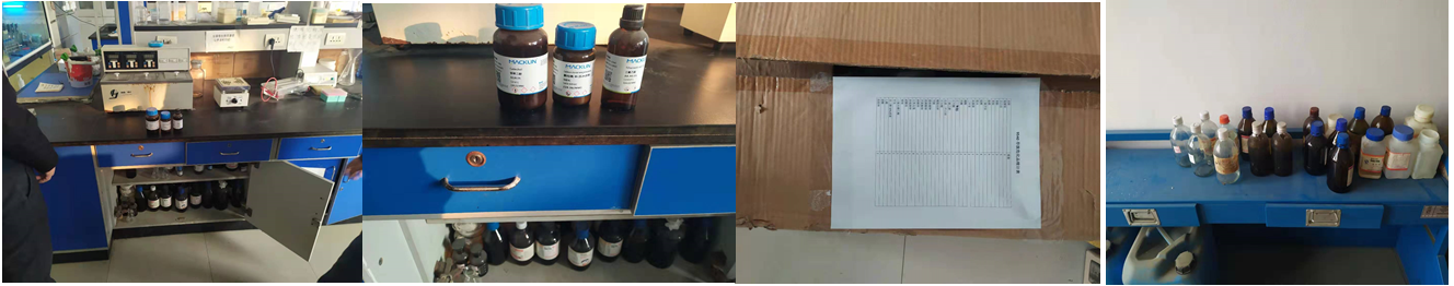 (1)危化品未入专用危化品柜、试剂清单不清、试剂瓶随意丢放