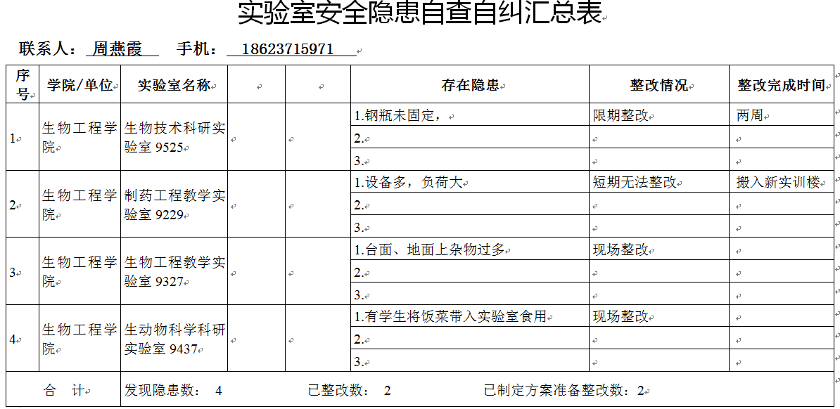 公共区域及暑期申请开放实验室的自查自纠排查,共查出四处隐患,详见附件2,其中现场整改两处,限期整改一处,短期无法整改一处,整改率达到百分之七十五。