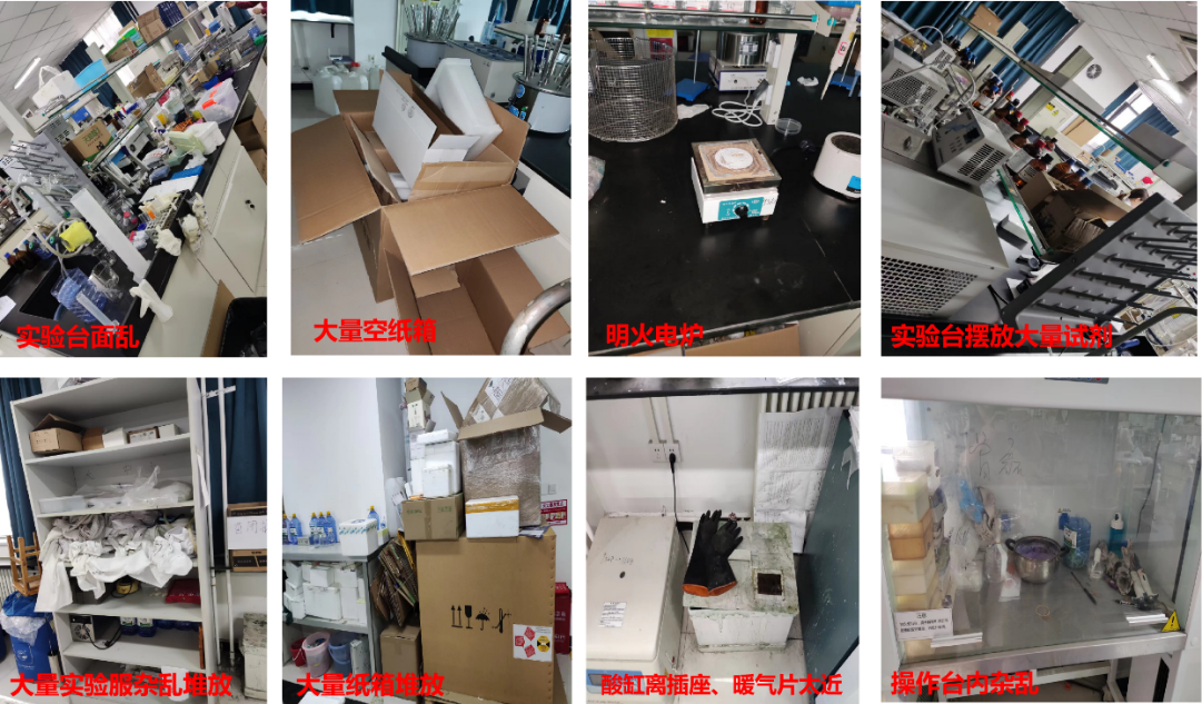 实验台桌面杂乱,纸箱堆放,明火电炉 |