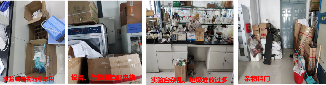 垃圾过多,实验台面杂乱,明火电炉,堆放物品挡门 |