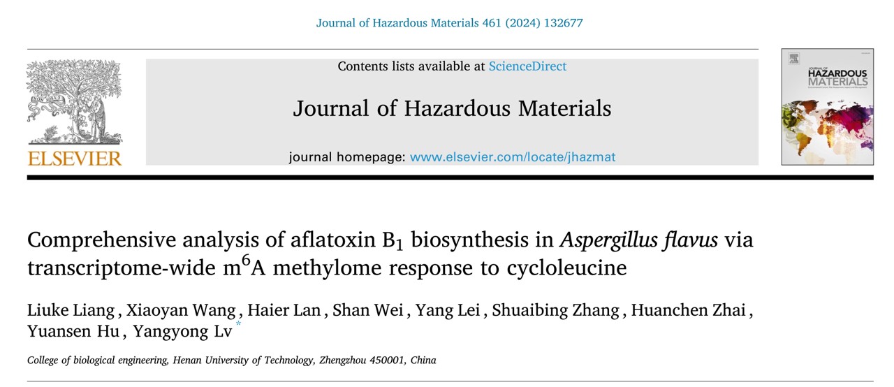 粮油食品微生物危害防控团队吕扬勇课题组在国际顶刊《Journal of Hazardous Materials》(中科院一区TOP,IF=13.6)上发表了题为“Comprehensive analysis of aflatoxin B1 biosynthesis in Aspergillus flavus via transcriptome- wide m6A methylome response to cycloleucine”的研究论文。该团队2021级硕士研究生梁柳柯为论文第一作者,吕扬勇为通讯作者,河南工业大学为第一署名单位和唯一通讯单位。