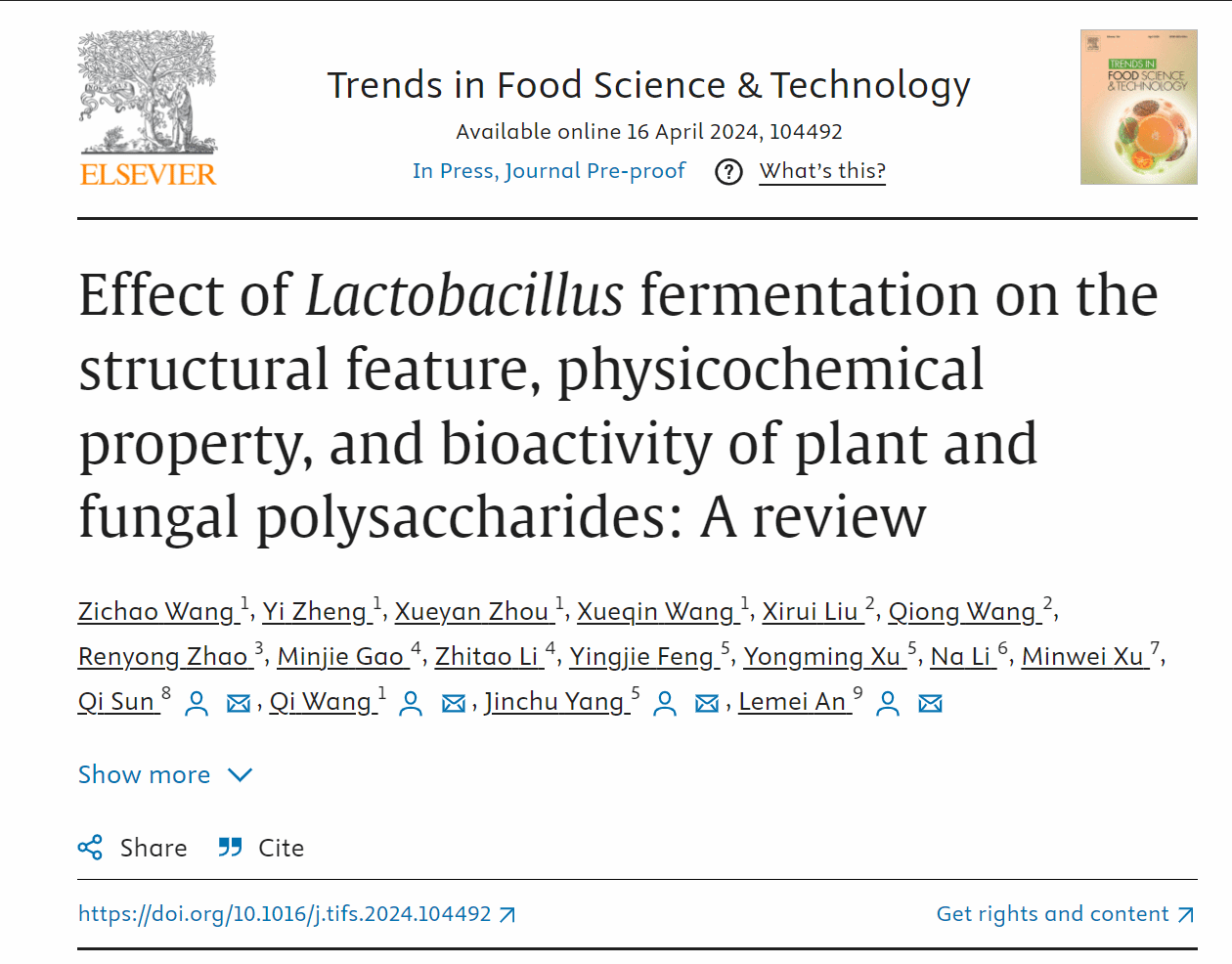 王子朝副教授课题组在食品领域国际顶级期刊Trends in Food Science & Technology(中科院一区,TOP期刊,IF = 15.3)上在线发表了题为:“Effect of Lactobacillus fermentation on the structural feature, physicochemical property, and bioactivity of plant and fungal polysaccharides: A review”的综述论文。该论文全面和系统的综述了近年来乳杆菌发酵对植物和真菌胞外多糖结构特征、理化特性、生物活性的影响。王子朝副教授是第一作者,捷报体育比分-捷报比分app