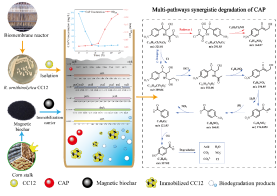 氯霉素(CAP)是一种广泛使用的广谱抗生素,长期残留在水体环境中,已造成严重的环境污染。微生物是生物降解和转化氯霉素的关键介质,然而能够实现其高效去除和完全矿化的微生物资源仍十分有限。本团队分离筛选到一株氯霉素降解菌Raoultella ornithinolytica CC12(具有知识产权),其在24小时内对300 mg/L 氯霉素的去除率高达99.32%;进一步采用玉米秸秆制备的磁性碳对其进行固定化后,不仅有效提高了菌体生物量,还将氯霉素去除量从271.87 mg/L·d提升至305.29 mg/L·d。全基因组分析结果表明,菌株CC12的高效降解能力与其所携带的与氯霉素降解相关的基因:acetyltransferase、nitroreductase、protocatechuate 3,4-dioxygenase和amido-linkage hydrolase等密切相关。这些基因共同介导了两条主要的氯霉素代谢途径:是硝基和酰胺基团的还原,‚是酰胺还原和丁酰化等反应。代谢产物毒性评估结果显示,其对费氏弧菌的光抑制率仅为4%,证实了其在降解过程中有效降低了环境风险。本研究系统比较了游离菌株与固定化菌株CC12降解氯霉素的性能,并从基因水平和代谢水平阐明了Raoultella ornithinolytica CC12的氯霉素降解机制,为氯霉素的生物处理提供了宝贵的微生物资源。