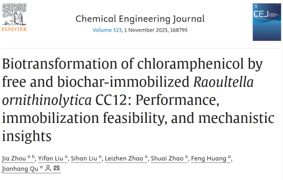 环境微生物与健康科技创新团队在环境工程领域的国际知名期刊《Chemical Engineering Journal》(中科院一区TOP,IF=13.2)上发表了题为“Biotransformation of chloramphenicol by free and biochar-immobilized Raoultella ornithinolytica CC12: performance, immobilization feasibility, and mechanistic insights”的研究论文。该团队周佳副教授为论文第一作者,屈建航教授为通讯作者,河南工业大学为第一署名单位和唯一通讯单位。