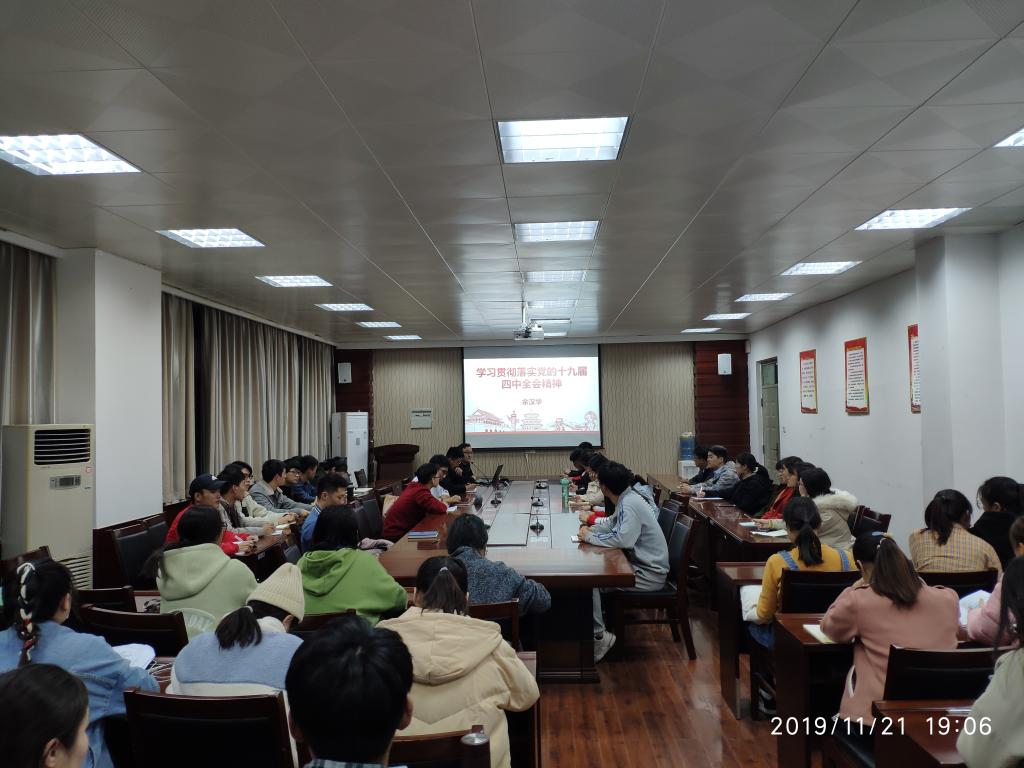 党委副书记余汉华,在9237会议室为学生党员讲授“学习贯彻落实党的十九届四中全会精神”为题的专题党课。