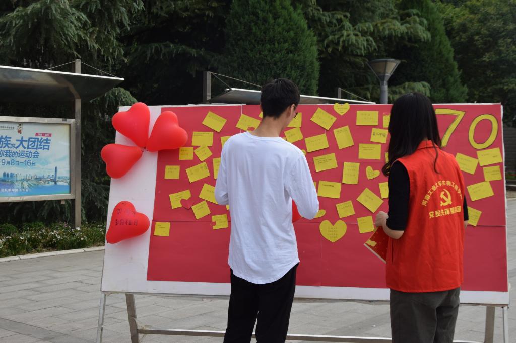 党日活动采取现场采访、写寄语、现场问卷调查、问答竞赛等多种形式进行,献礼新中国成立70周年。在活动中,党员先锋和志愿者们面带微笑,热情洋溢的向来往学生发放小卡片,党员们在卡片上写下自己的初心,随后党员们接受现场采访,有的同学选择参与问卷调查,深深地向新中国成立70周年献礼。在现场采访环节,党员们表达出新中国成立70年来,发生的翻天覆地变化,中国特色进入新时代,新时代作为大学生肩负的责任。活动还设有答题竞赛环节,竞赛内容主要涉及党的十九大和习近平新时代中国特色社会主义思想的理论知识。活动气氛热烈,感染力强,同学们纷纷表示,活动的参加能够深刻的认识到近代以来,中国人民从站起来,到富起来,再到强起来的变化,同时,还能够掌握到理论知识,认识到在新时代肩负的历史责任和使命,并表示将牢记初心使命,刻苦努力学习,为实现中华民族伟大复兴贡献青春力量。
